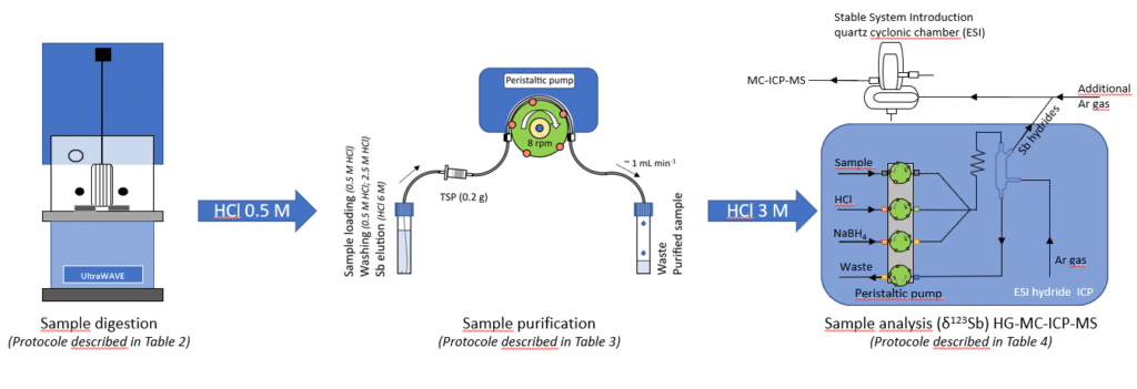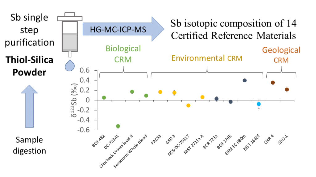 Antimony isotopes have been recently used as geochemical tracers for archeological or environmental purposes. The purification of antimony in samples with a low Sb concentration and a complex matrix is a critical step to measure the 123Sb/121Sb ratio by hydride generation coupled to a multi-collector inductively coupled plasma mass spectrometer (HG-MC-ICP-MS). A single-step purification method based on the use of thiol-functionalized mesoporous silica powder (TSP) was developed to separate antimony from other elements. A low amount of Sb (40–100 ng) is required thanks to low procedural blanks (<1 ng Sb) and an efficient removal (98.7% on average) of potential interfering elements (including As, Cd, Co, Cr, Cu, Fe, Ni, Pb, Se, and Sn). The method was validated on fourteen Certified Reference Materials (CRMs) including environmental materials (sediments and soils), biological materials (plants, human blood and urine), rocks and anthropogenic materials (fly ash, road dust and polyethylene). Antimony was recovered at 100 ± 7% and no isotopic fractionation occurred during the procedure. The isotopic composition of Sb (δ123Sb) in the CRMs ranged between −0.52 ± 0.06‰ (2 sd) and 0.40 ± 0.03‰ (2 sd) relative to an in-house isotopic standard solution (SPEX). The external reproducibility was evaluated at 0.05‰ (2 sd) for δ123Sb, based on replicated measurements of independently digested and purified CRMs. CRMs GSD-3, SDO-1 and BCR-176R exhibited δ123Sb values similar to previous measurements by Rouxel et al. (2003). In addition, three pure standard solutions of Sb were measured against the in-house isotopic standard solution. Two of them were isotopically similar (δ123Sb = 0.00 ± 0.05‰, Sb Fisher Scientific® and PlasmaCAL-1, SCP Science®), while a δ123Sb value of 0.62 ± 0.02‰ was measured for the third one (PlasmaCAL-2, SCP Science®). This raises the importance of choosing a common isotopic standard solution to compare already published and future Sb isotope data.