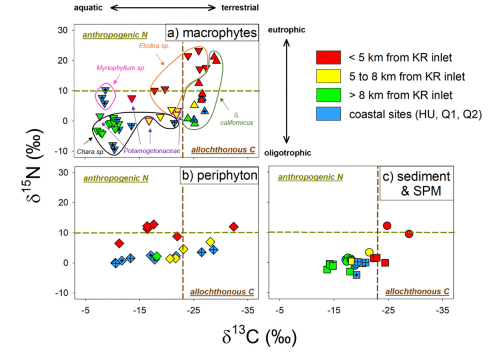 δ15N signatures track anthropogenic contamination independently of plant type.